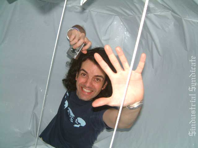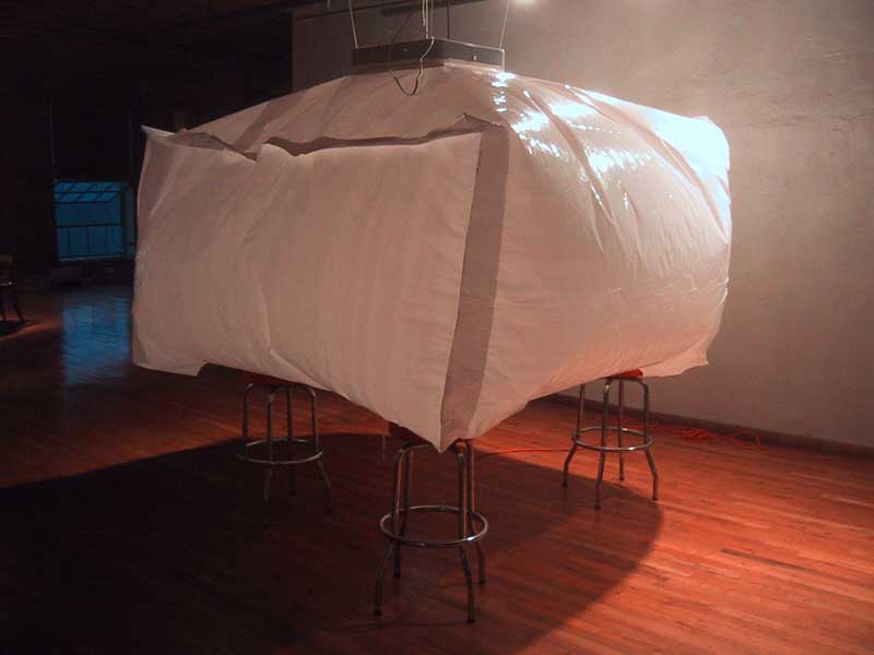Cloudbox for $industrial $yndicate![]() Events: Hard Breaks Hotel, Tu$$ Enuf Venue: Private, Openair Date: 20030317 Description: Inflatable structure hung from the ceiling. Up to 4 people can enter the structure up to the waist and sit on stools. A square piece of cardboard holding the structure from underneath is used as a table inside. Cloudbox is lit from the inside with glowsticks or a chandelier made of christmas lights in a plastic bag hanging from the central fan. Specs: Surface (square feet): 64 Overall dimensions (feet): 8 x 8 Material: 4 mil white opaque plastic, duct tape, cardboard, rope. Assembly: 4 hours, 1 person Cloudbox: