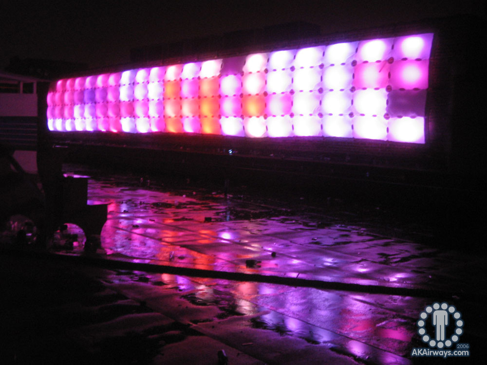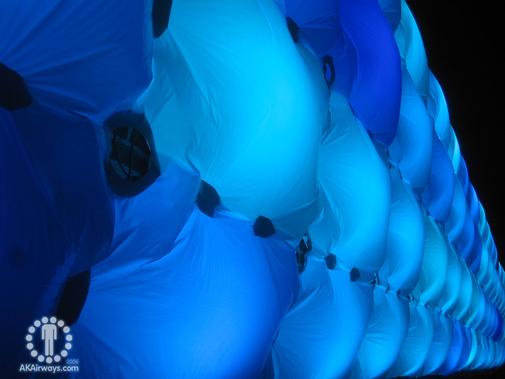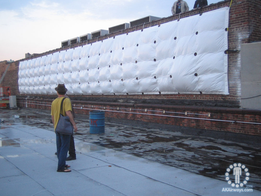 Comforter with Leo Villareal Inflatable light installation ![]() Comforter is an inflatable light installation with a matrix of chambers that each host an LED-based light fixture. Each chamber acts as a reflector/diffuser for the light behind. Together, they become giant pixels of this light sculpture sequenced by Leo Villareal (examples of Leo's work). ![]() Event: Ascension Venue: Brooklyn Sugar, Brooklyn Date: 20060518 Specs: Surface (square feet): 900 Overall dimensions (feet): 90 x 10 x 2 Material: 4 mil white polyethylene Assembly: 50 hours, 4 persons Set-up: 40 hours, 4 persons Break-down: 4 hours, 4 persons