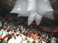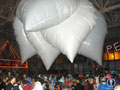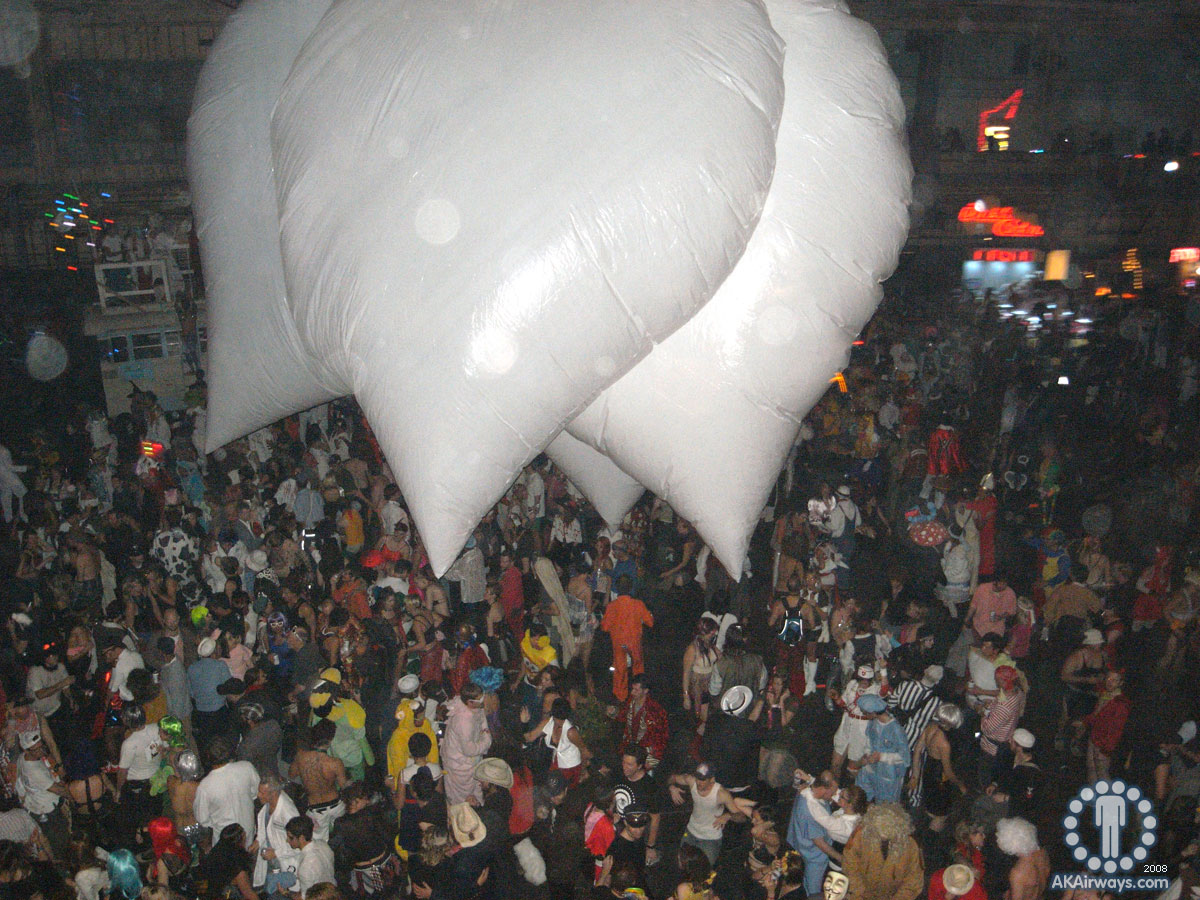 Reentry Kinetic Ceiling Installation above the Dancefloor for Allison ![]() Eight teardrop-shaped inflatable volumes hung from the ceiling inflate and deflate in concert. Event: GhostShip Venue: Private hanger Address: Treasure Island, San Francisco Date: November 1, 2008 Specs: Dimensions inflated (feet): 50 x 50 x 25 Material: polyethylene, fans Presentation method: hanging from the ceiling Reentry at GhostShip:
