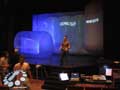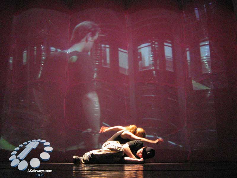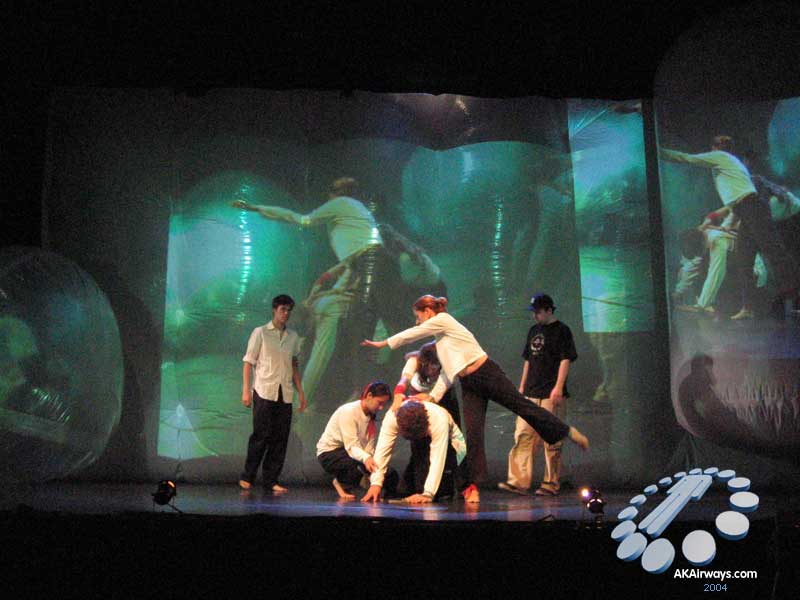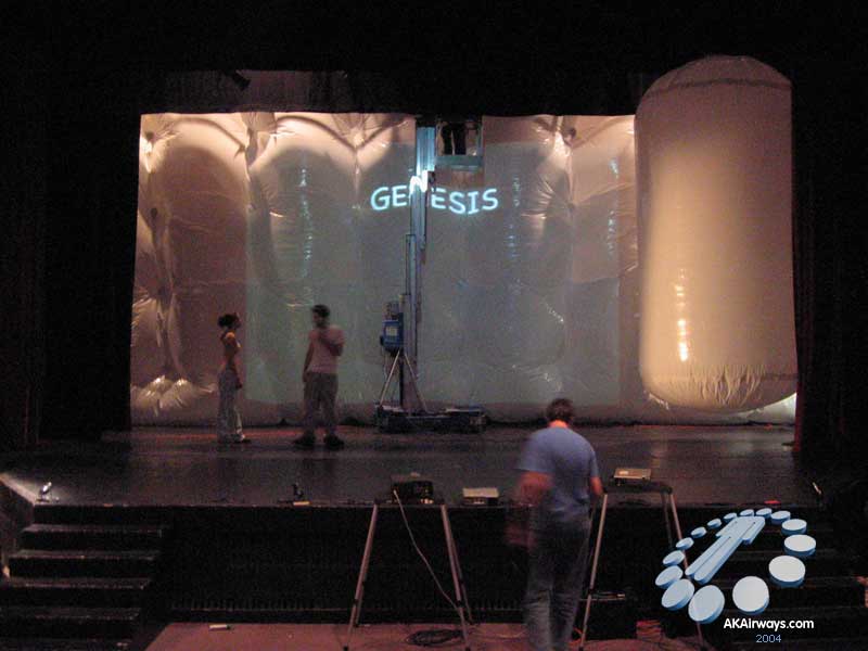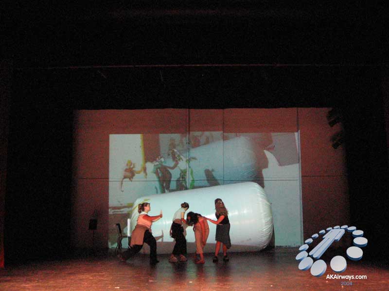 Ars Nova at New York University An inflatable set for a multimedia performance. ![]() Click image to enlarge Event: Ars Nova Venue: Frederick Loewe Auditorium, New York University Date: 20040623 Plan A Description: Two cylinders inflate and deflate at different stages of the performance. The backdrop of the stage is a white inflatable curtain used as a screen for projections. Dancers and musicians can perform inside the cylinder set on the stage. The cylinder on the right of the stage is mostly used for video projection. ![]() Specs: Surface (square feet): 1200 Overall dimensions (feet): 40 x 30 x 25 Material: 4 mil clear and white opaque plastic Assembly (estimated): 10 hours, 2 persons Installation (estimated): 10 hours, 2 persons Plan B Description: Three cylinders inflate and deflate at different stages of the performance. Dancers and musicians perform inside and outside the structures. This takes place in a classical performance setting, on a stage. ![]() ![]() Specs: Surface (square feet): 1200 Overall dimensions (feet): 40 x 30 x 25 Material: 4 mil clear and white opaque plastic Assembly (estimated): 10 hours, 2 persons Installation (estimated): 10 hours, 2 persons ![]() In collaboration with Dr. John Gilbert. Space: