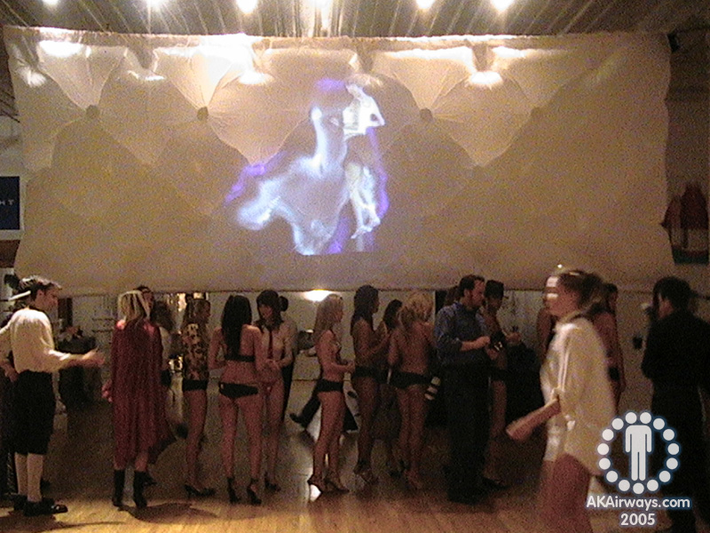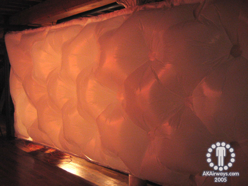 Matelassé Inflatable screen ![]() A thick inflatable screen uses a matelassé pattern to create a bas-relief. Event: Toshi Halloween Party Venue: Puck building, NYC Date: 20051029 Specs: Surface (square feet): n/a Overall dimensions (feet): 20 x 8 x 2 Material: 4 mil white polyethylene Assembly (estimated): 3 hours, 2 persons Installation (estimated): 2 hours, 2 persons Clean-up (estimated): 1 hour, 1 person Preparty: